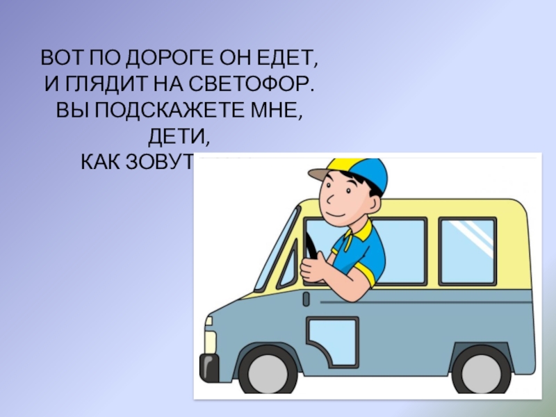 ВОТ ПО ДОРОГЕ ОН ЕДЕТ,И ГЛЯДИТ НА СВЕТОФОР.ВЫ ПОДСКАЖЕТЕ МНЕ, ДЕТИ,КАК ЗОВУТ ЕГО? …