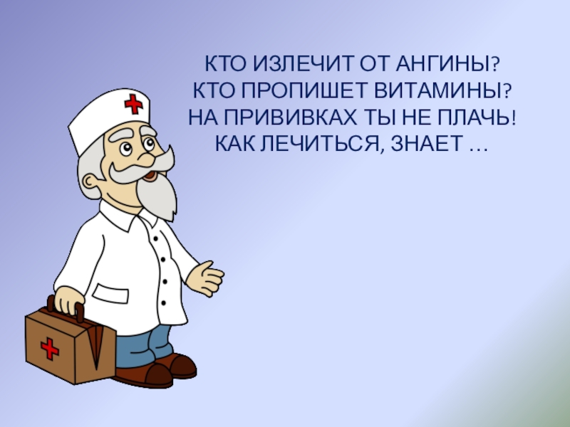 КТО ИЗЛЕЧИТ ОТ АНГИНЫ?КТО ПРОПИШЕТ ВИТАМИНЫ?НА ПРИВИВКАХ ТЫ НЕ ПЛАЧЬ!КАК ЛЕЧИТЬСЯ, ЗНАЕТ …