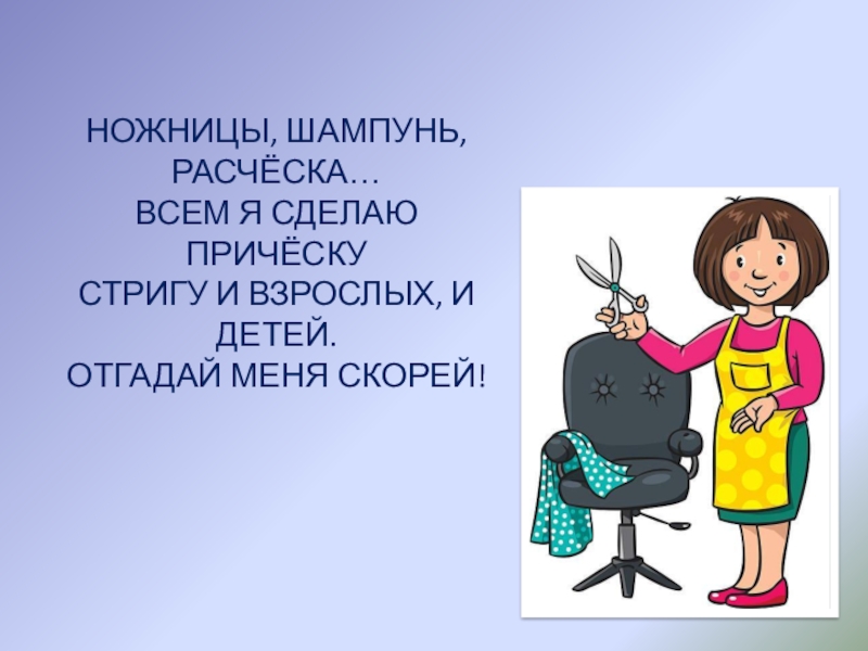 НОЖНИЦЫ, ШАМПУНЬ, РАСЧЁСКА…ВСЕМ Я СДЕЛАЮ ПРИЧЁСКУСТРИГУ И ВЗРОСЛЫХ, И ДЕТЕЙ.ОТГАДАЙ МЕНЯ СКОРЕЙ!
