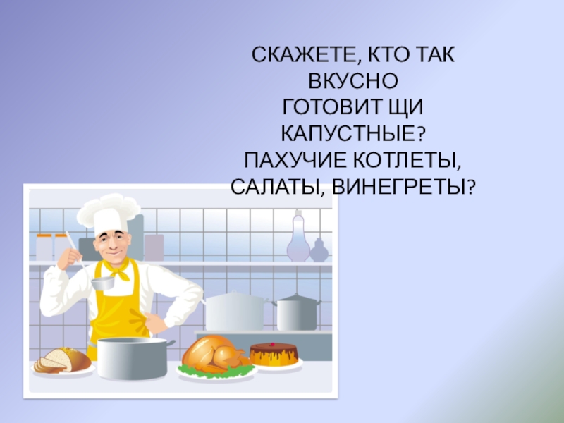 СКАЖЕТЕ, КТО ТАК ВКУСНОГОТОВИТ ЩИ КАПУСТНЫЕ?ПАХУЧИЕ КОТЛЕТЫ,САЛАТЫ, ВИНЕГРЕТЫ?
