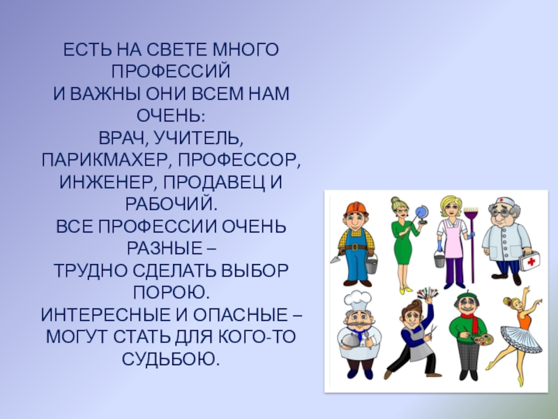 ЕСТЬ НА СВЕТЕ МНОГО ПРОФЕССИЙИ ВАЖНЫ ОНИ ВСЕМ НАМ ОЧЕНЬ:ВРАЧ, УЧИТЕЛЬ,ПАРИКМАХЕР, ПРОФЕССОР,ИНЖЕНЕР, ПРОДАВЕЦ И РАБОЧИЙ.ВСЕ ПРОФЕССИИ ОЧЕНЬ РАЗНЫЕ – ТРУДНО СДЕЛАТЬ ВЫБОР ПОРОЮ.ИНТЕРЕСНЫЕ И ОПАСНЫЕ – МОГУТ СТАТЬ ДЛЯ КОГО-ТО СУДЬБОЮ.