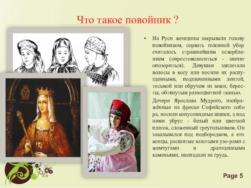 Дочери Ярослава Мудрого, изобра-жённые на фреске Софийского собо ра, носили конусовидные шапки, а под ними убрус - белый или цветной платок, сложенный треугольником. Он закалывался под подбородком, а его концы, расшитые золотыми узо-рами с жемчугами и драгоценными каменьями, ниспадали на грудь.