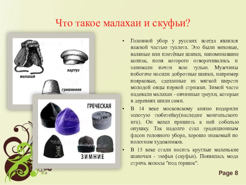 частью туалета. Это были меховые, валяные или плетёные шапки, напоминавшие колпак, поля которого отворачивались и занимали почти всю тулью. Мужчины побогаче носили добротные шапки, например поярковые, сделанные из мягкой шерсти молодой овцы первой стрижки. Зимой часто надевали малахаи - овчинные треухи, которые в деревнях шили сами.