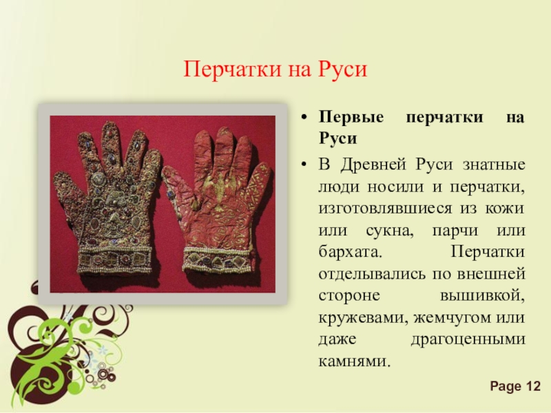 и перчатки, изготовлявшиеся из кожи или сукна, парчи или бархата. Перчатки отделывались по внешней стороне вышивкой, кружевами, жемчугом или даже драгоценными камнями.