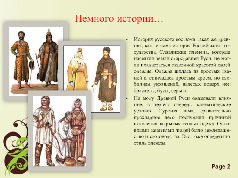 На моду Древней Руси оказывали влия-ние, в первую очередь, климатические условия. Суровая зима, сравнительно прохладное лето послужили причиной появления закрытых теплых одежд. Осно-вными занятиями людей было землепаше-ство и скотоводство. Это тоже определяло стиль одежды.