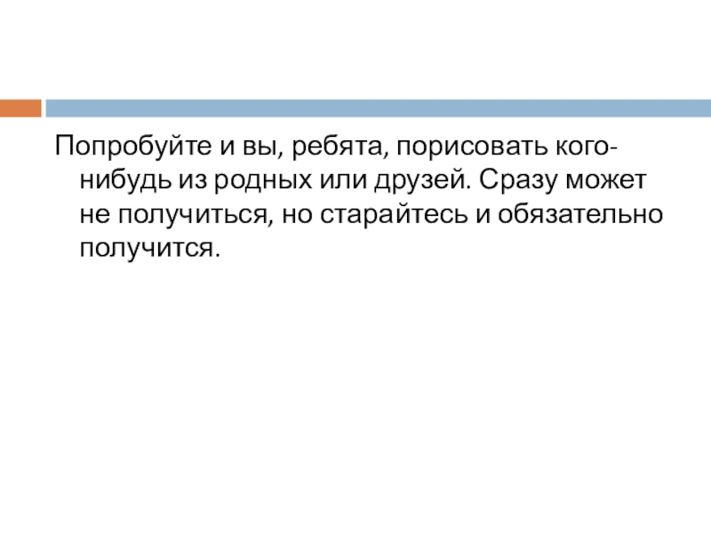 Слайд 15Попробуйте и вы, ребята, порисовать кого-нибудь из родных или друзей. Сразу