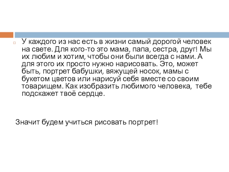 свете. Для кого-то это мама, папа, сестра, друг! Мы их любим и хотим, чтобы они были всегда с нами. А для этого их просто нужно нарисовать. Это, может быть, портрет бабушки, вяжущей носок, мамы с букетом цветов или нарисуй себя вместе со своим товарищем. Как изобразить любимого человека, тебе подскажет твоё сердце.