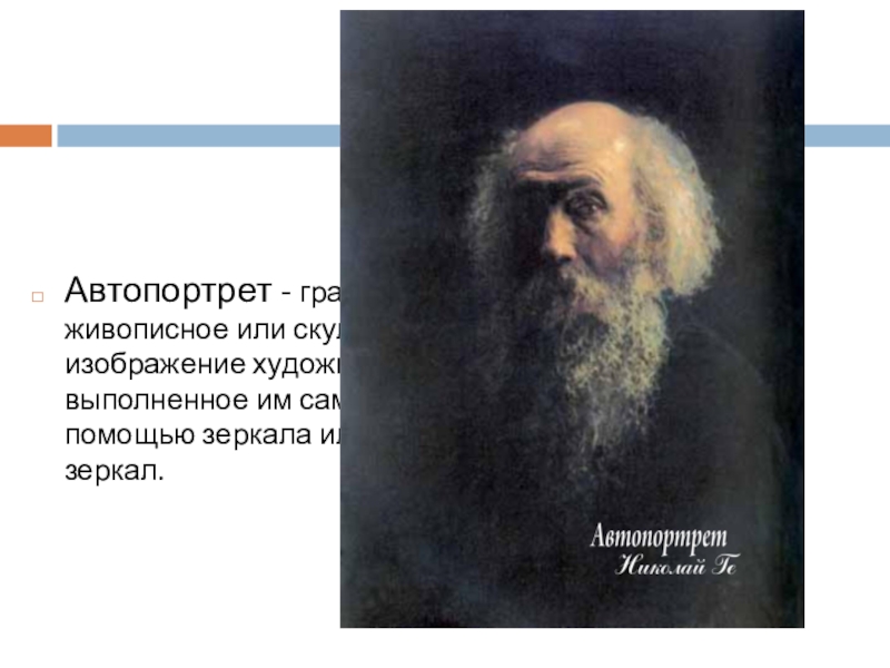 Слайд 8Автопортрет - графическое, живописное или скульптурное изображение художника, выполненное им самим