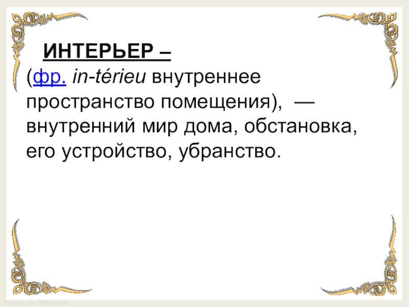 Слайд 3 ИНТЕРЬЕР – (фр. in-térieu внутреннее пространство помещения),  —внутренний мир дома, обстановка,