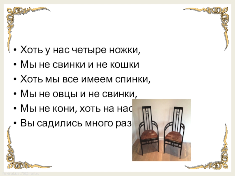 Хоть у нас четыре ножки,Мы не свинки и не кошкиХоть мы все имеем спинки,Мы не овцы и
