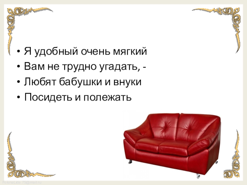 Я удобный очень мягкийВам не трудно угадать, -Любят бабушки и внукиПосидеть и полежать