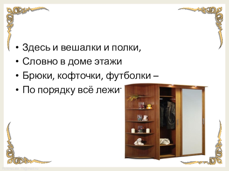Здесь и вешалки и полки,Словно в доме этажиБрюки, кофточки, футболки –По порядку всё лежит