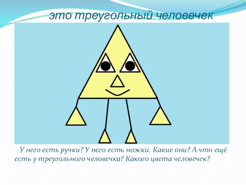 есть ручки? У него есть ножки. Какие они? А что ещё есть у треугольного человечка? Какого цвета человечек?