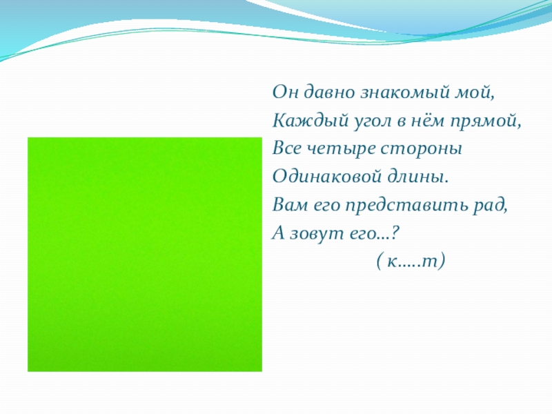 Он давно знакомый мой,Каждый угол в нём прямой,Все четыре стороныОдинаковой длины.Вам его представить рад,А зовут его…?