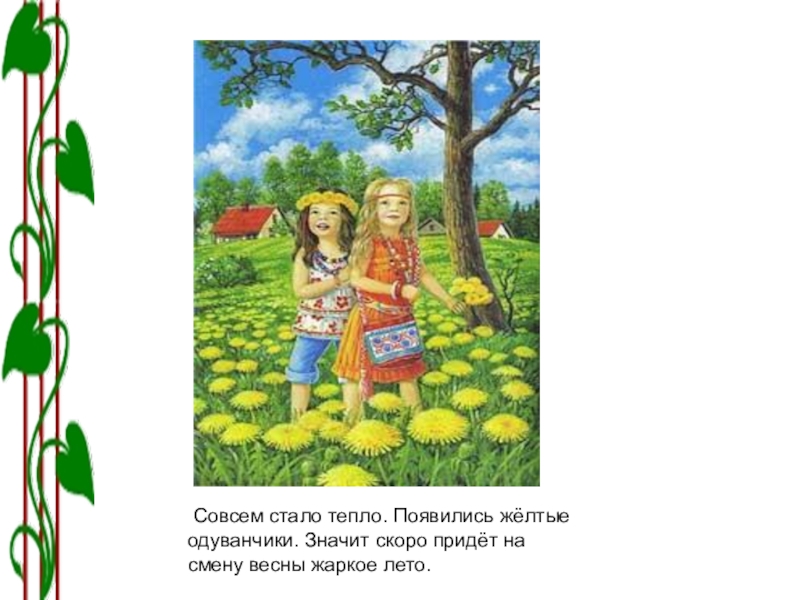 Слайд 10 Совсем стало тепло. Появились жёлтые одуванчики. Значит скоро придёт на