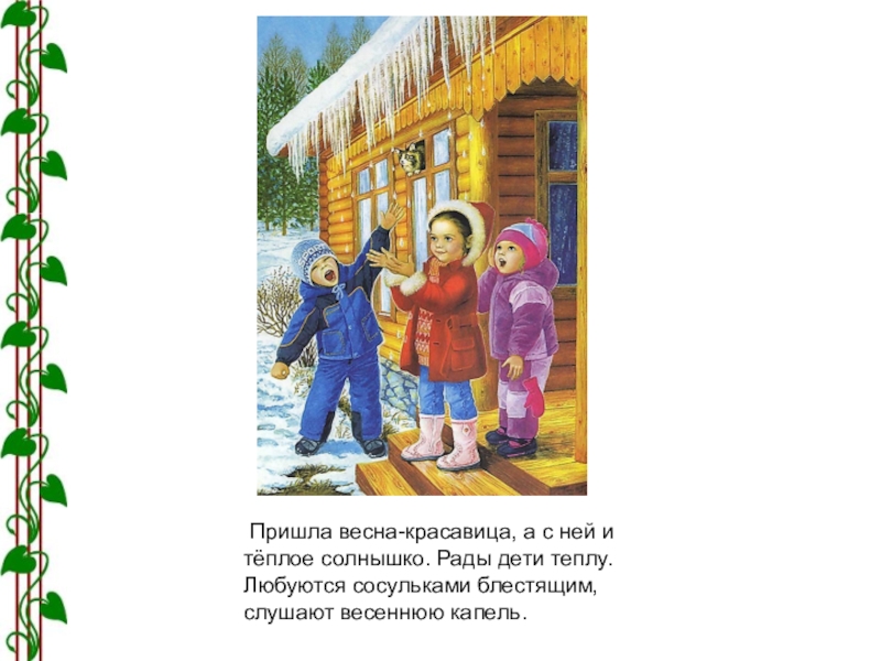 Слайд 3 Жарче пригрело солнышко. Растаял снег. Потекли по дорогам ручьи. Ребятишкам