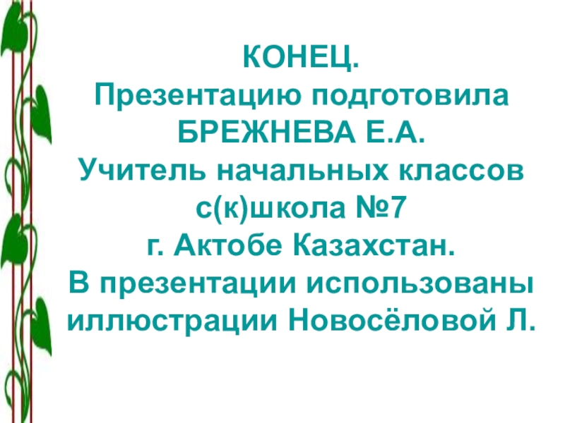 КОНЕЦ. Презентацию подготовила БРЕЖНЕВА Е.А. Учитель начальных классов с(к)школа №7 г. Актобе Казахстан. В презентации использованы иллюстрации