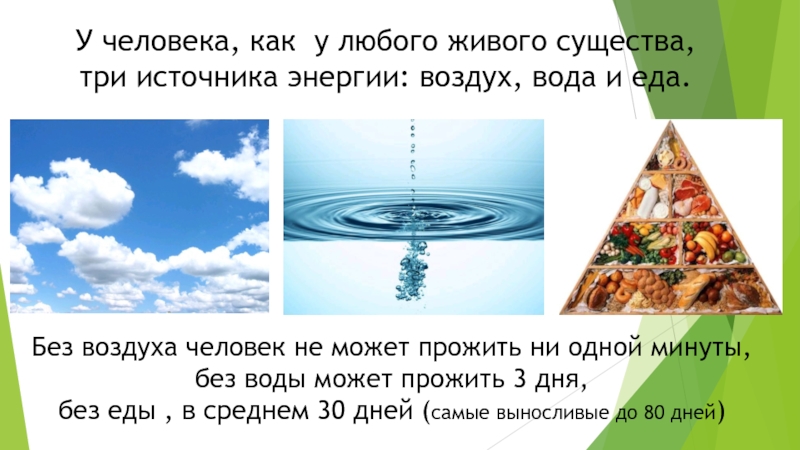 Без воздуха человек не может прожить ни одной минуты, без воды может прожить 3 дня,