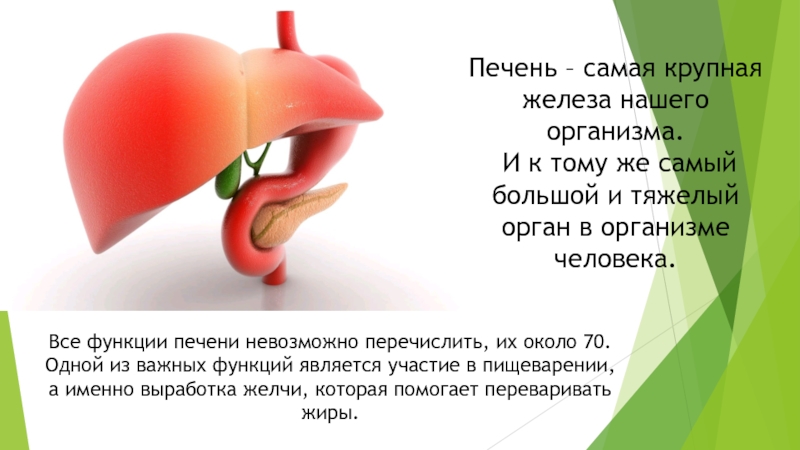 Все функции печени невозможно перечислить, их около 70. Одной из важных функций является участие в пищеварении, а именно выработка желчи, которая помогает переваривать жиры.