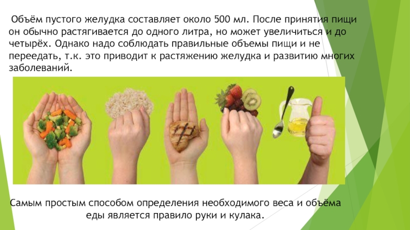 Самым простым способом определения необходимого веса и объёма еды является правило руки и кулака.