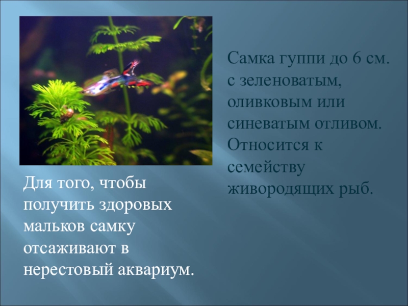 Для того, чтобы получить здоровых мальков самку отсаживают в нерестовый аквариум.