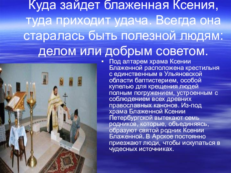 Под алтарем храма Ксении Блаженной расположена крестильня с единственным в Ульяновской области баптистерием, особой купелью для крещения людей полным погружением, устроенным с соблюдением всех древних православных канонов. Из-под храма Блаженной Ксении Петербургской вытекают семь родников, которые, объединяясь, образуют святой родник Ксении Блаженной. В Арское постоянно приезжают люди, чтобы искупаться в чудесных источниках.