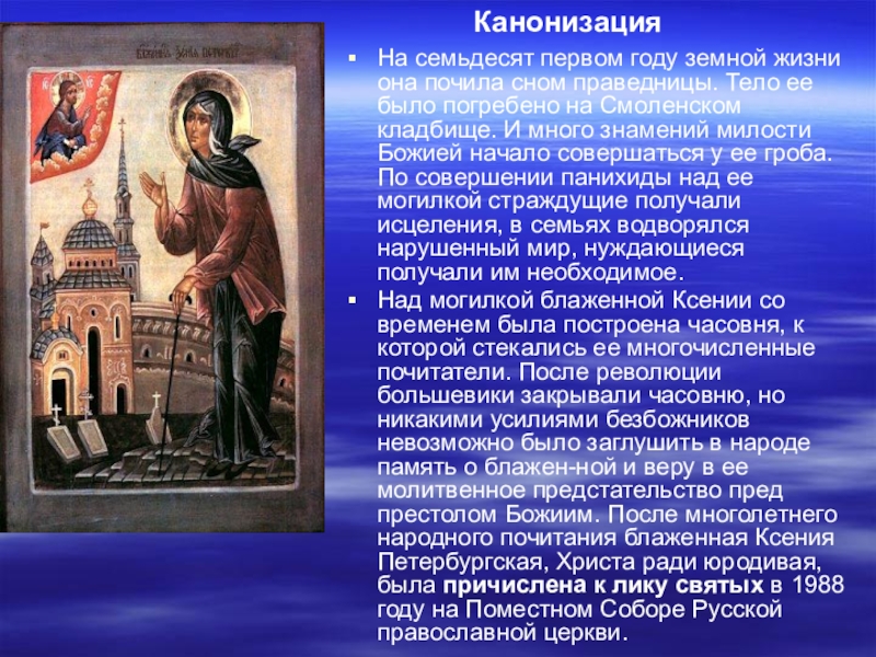 Над могилкой блаженной Ксении со временем была построена часовня, к которой стекались ее многочисленные почитатели. После революции большевики закрывали часовню, но никакими усилиями безбожников невозможно было заглушить в народе память о блажен-ной и веру в ее молитвенное предстательство пред престолом Божиим. После многолетнего народного почитания блаженная Ксения Петербургская, Христа ради юродивая, была причислена к лику святых в 1988 году на Поместном Соборе Русской православной церкви.