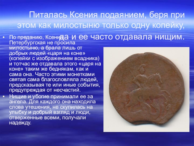 По преданию, Ксения Петербургскaя не просила милостыню, а брала лишь от добрых людей «царя на коне» (копейки с изображением всадника) и тотчас же отдавала этого «царя на коне» таким же беднякам, как и сама она. Часто этими монетками святая сама благословляла людей, предсказывая те или иные события, предупреждая от несчастий.