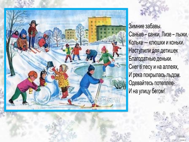 Снег в лесу и на аллеях, И река покрылась льдом. Одевайтесь потеплее- И на улицу бегом!