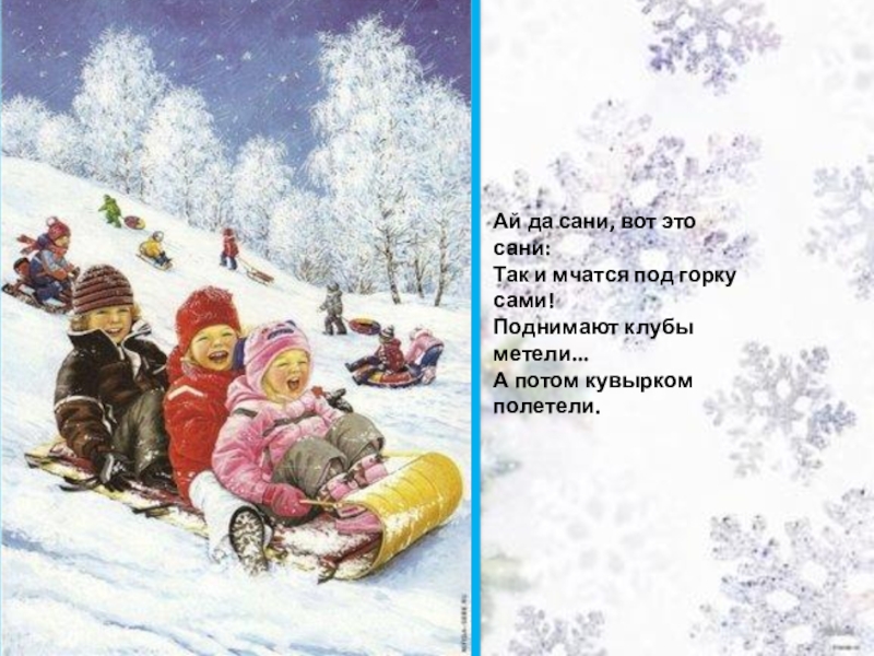 Слайд 2Ай да сани, вот это сани: Так и мчатся под горку сами! Поднимают