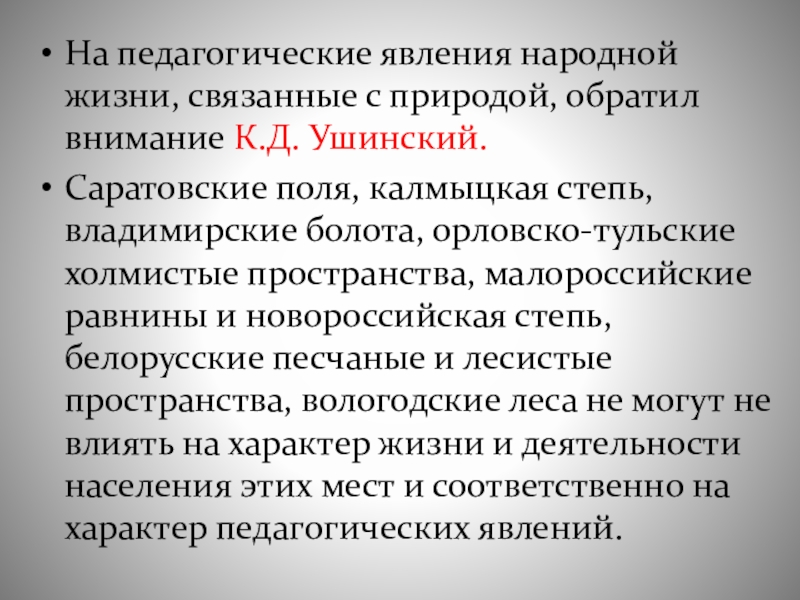 Слайд 9На педагогические явления народной жизни, связанные с природой, обратил внимание К.Д.