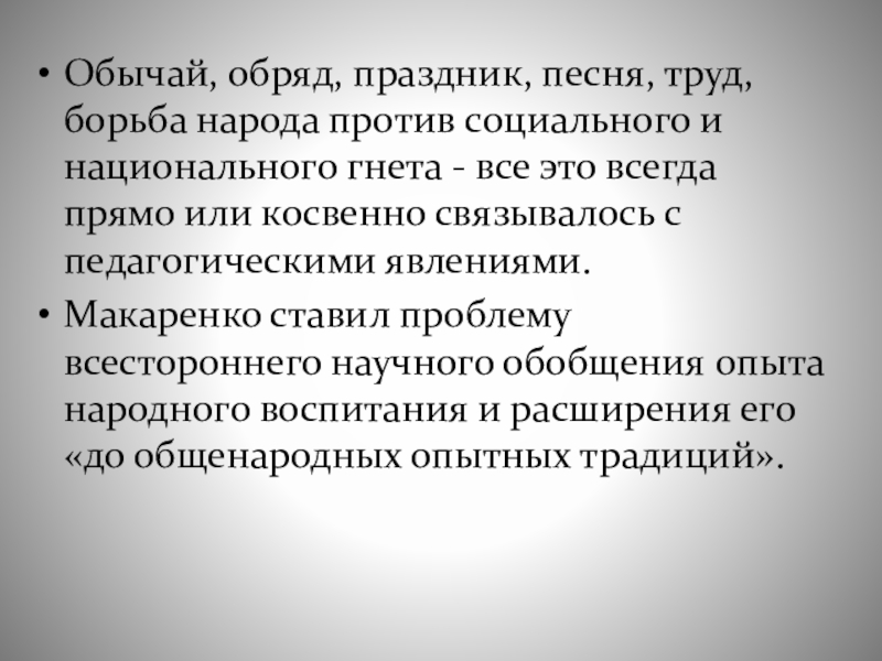 Макаренко ставил проблему всестороннего научного обобщения опыта народного воспитания и расширения его «до общенародных опытных традиций».