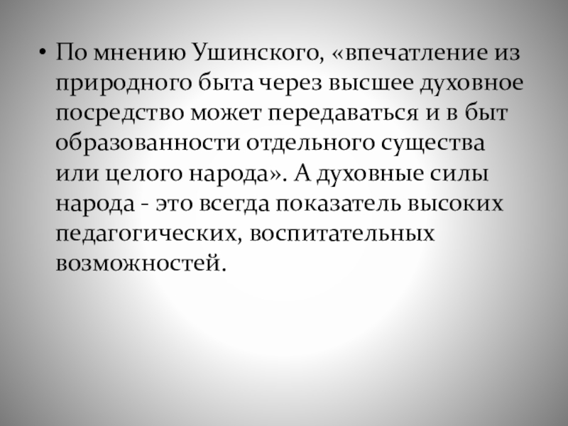 Слайд 10По мнению Ушинского, «впечатление из природного быта через высшее духовное посредство