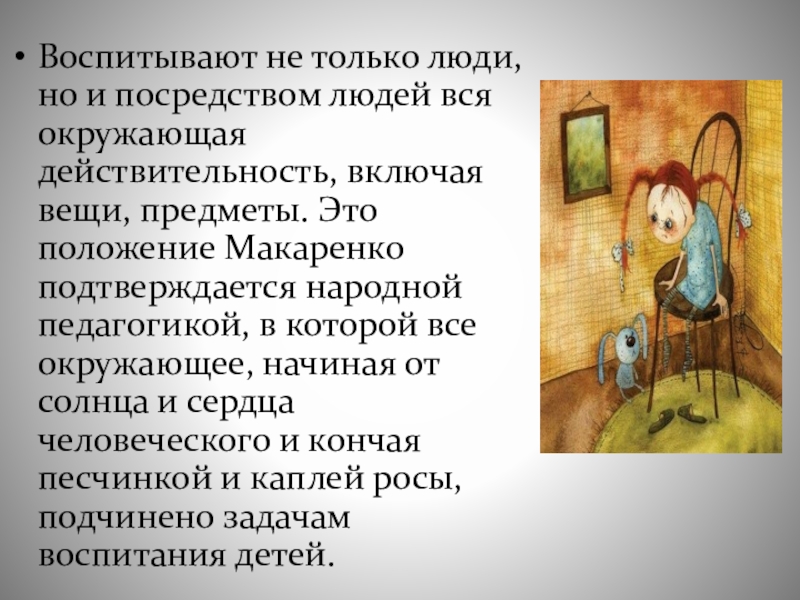 включая вещи, предметы. Это положение Макаренко подтверждается народной педагогикой, в которой все окружающее, начиная от солнца и сердца человеческого и кончая песчинкой и каплей росы, подчинено задачам воспитания детей.