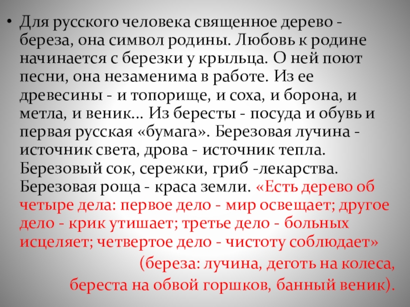 к родине начинается с березки у крыльца. О ней поют песни, она незаменима в работе. Из ее древесины - и топорище, и соха, и борона, и метла, и веник... Из бересты - посуда и обувь и первая русская «бумага». Березовая лучина - источник света, дрова - источник тепла. Березовый сок, сережки, гриб -лекарства. Березовая роща - краса земли. «Есть дерево об четыре дела: первое дело - мир освещает; другое дело - крик утишает; третье дело - больных исцеляет; четвертое дело - чистоту соблюдает»