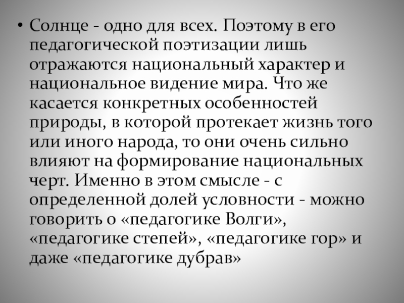 отражаются национальный характер и национальное видение мира. Что же касается конкретных особенностей природы, в которой протекает жизнь того или иного народа, то они очень сильно влияют на формирование национальных черт. Именно в этом смысле - с определенной долей условности - можно говорить о «педагогике Волги», «педагогике степей», «педагогике гор» и даже «педагогике дубрав»