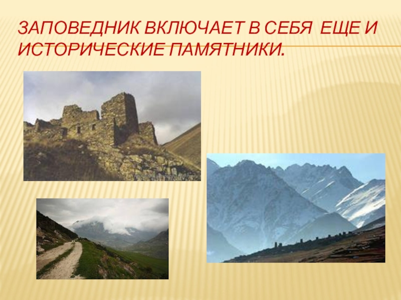 Слайд 5Заповедник включает в себя еще и исторические памятники.