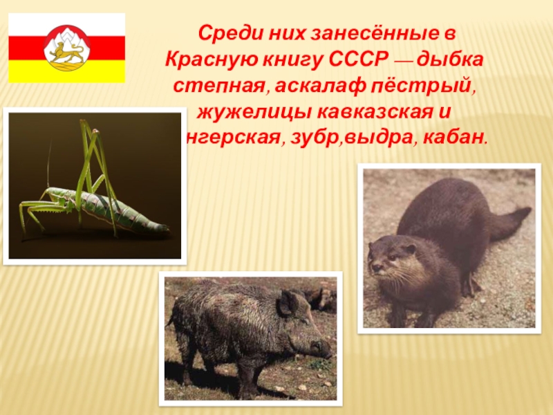 аскалаф пёстрый, жужелицы кавказская и венгерская, зубр,выдра, кабан.
