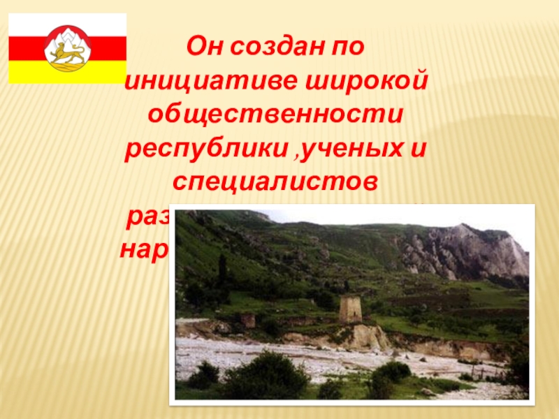 Слайд 4Он создан по инициативе широкой общественности республики ,ученых и специалистов различных