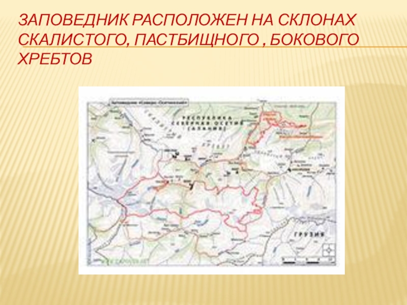 Слайд 3Заповедник расположен на склонах Скалистого, Пастбищного , бокового хребтов
