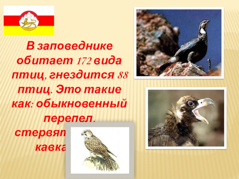 Слайд 7В заповеднике обитает 172 вида птиц, гнездится 88 птиц. Это такие