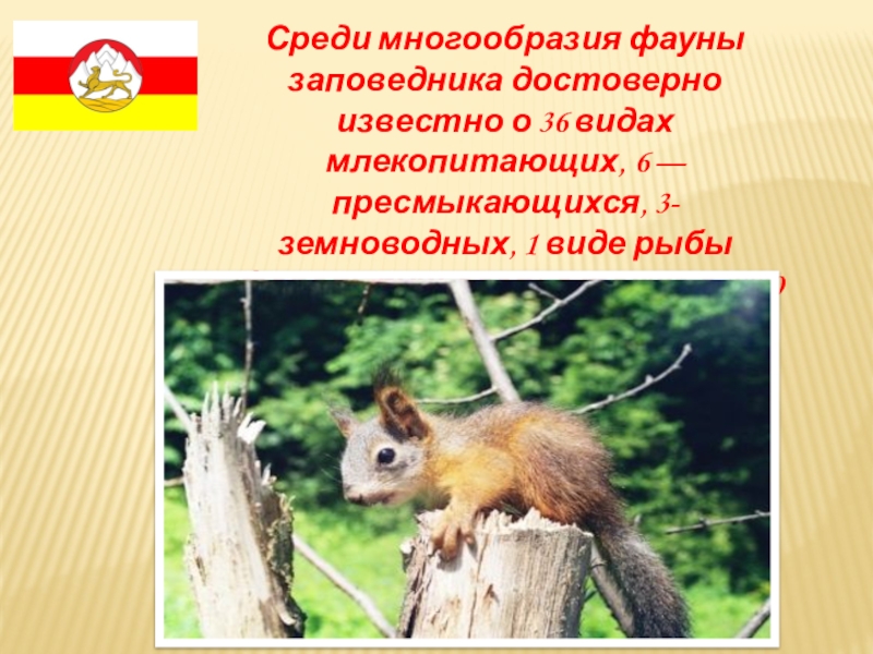Слайд 9Среди многообразия фауны заповедника достоверно известно о 36 видах млекопитающих, 6