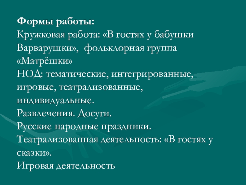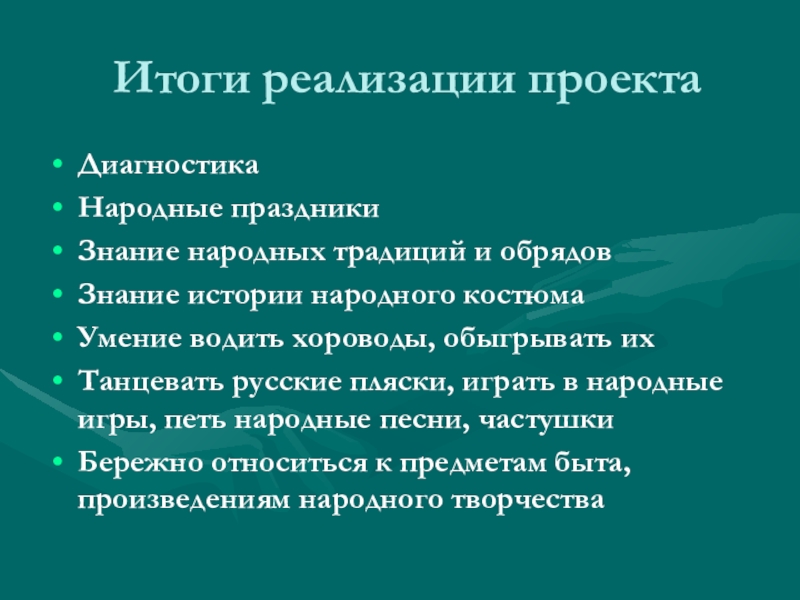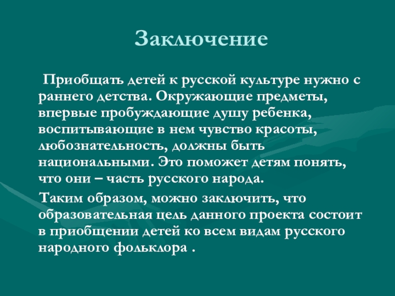 Таким образом, можно заключить, что образовательная цель данного проекта состоит в приобщении детей ко всем видам русского народного фольклора .