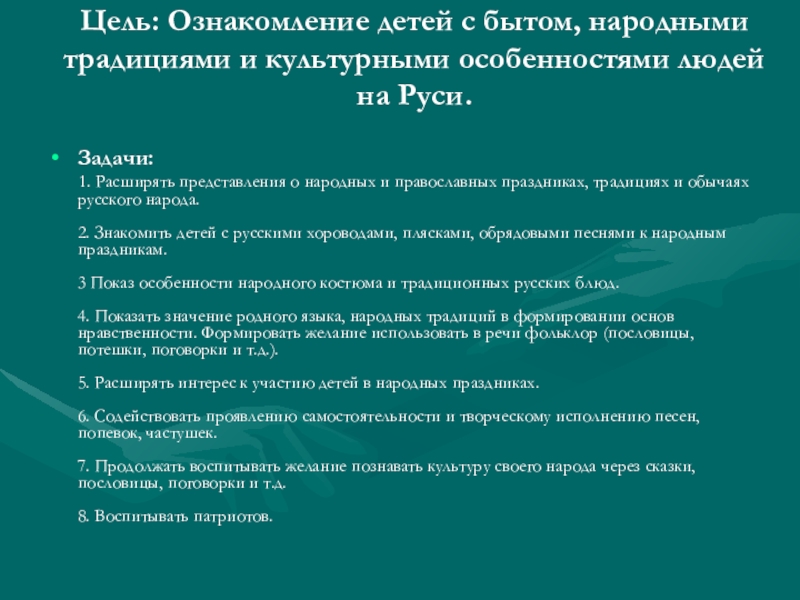 1. Расширять представления о народных и православных праздниках, традициях и обычаях русского народа.