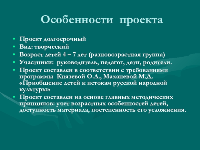 Проект составлен в соответствии с требованиями программы Князевой О.Л., Маханевой М.Д. «Приобщение детей к истокам русской народной культуры»