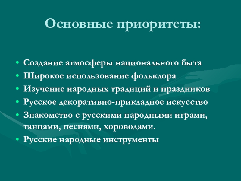 детства. Окружающие предметы, впервые пробуждающие душу ребенка, воспитывающие в нем чувство красоты, любознательность, должны быть национальными. Это поможет детям понять, что они – часть русского народа.