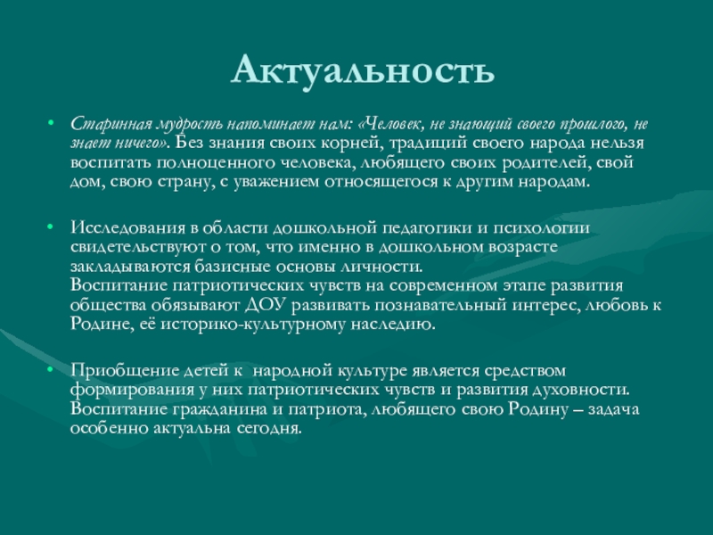 ничего». Без знания своих корней, традиций своего народа нельзя воспитать полноценного человека, любящего своих родителей, свой дом, свою страну, с уважением относящегося к другим народам.