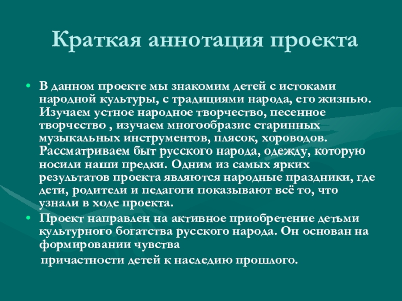Проект направлен на активное приобретение детьми культурного богатства русского народа. Он основан на формировании чувства