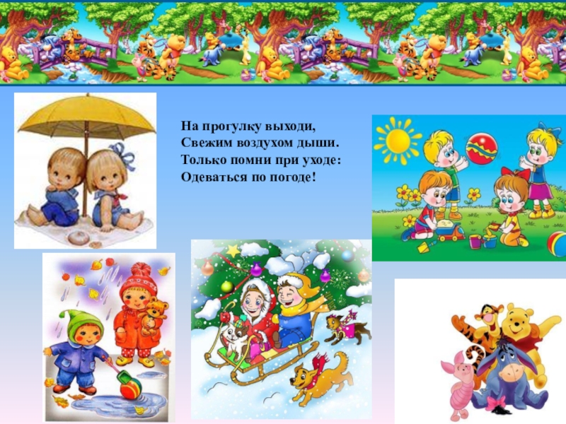 На прогулку выходи,  Свежим воздухом дыши.  Только помни при уходе:  Одеваться по погоде!