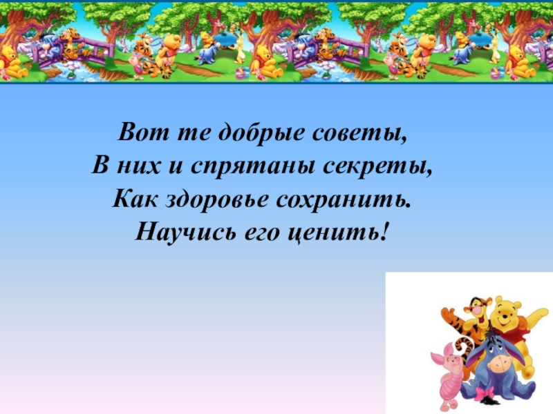 Слайд 11Вот те добрые советы,  В них и спрятаны секреты,  Как здоровье сохранить.  Научись его